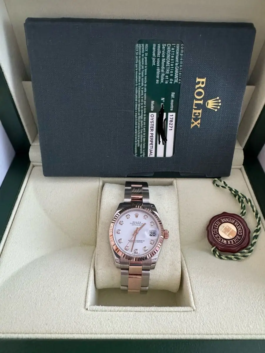 The 2010 Rolex Datejust 31mm Two-Tone Rose is a timeless classic, combining elegance with everyday wearability. Featuring a 31mm stainless steel and rose gold case, an automatic movement, and Rolex’s signature craftsmanship, this pre-owned piece remains in excellent condition. Comes with the original box and documents.